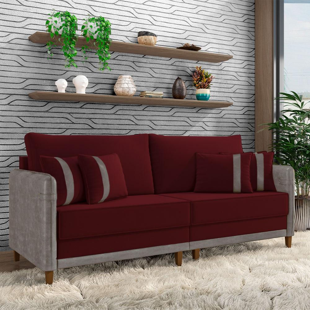 Sofá Living Montecarlo 2 Lugares Bipartido 192cm Pés em Madeira Veludo/PU Bordô/Cinza G33 - Gran Be