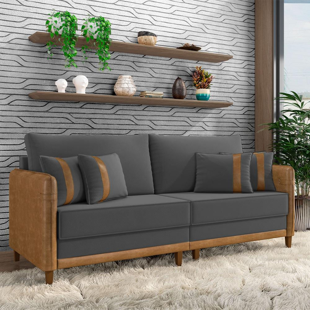 Sofá Living Montecarlo 2 Lugares Bipartido 192cm Pés em Madeira Veludo/PU Grafite/Caramelo G33 - Gra