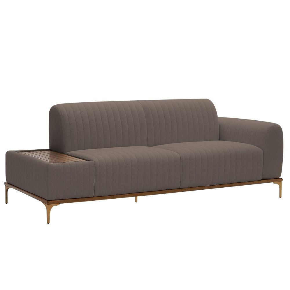 Sofá Molino com Mesa Estofada – Conforto e Praticidade com Elegância Um design funcional e sofisticado que combina estilo, conforto e versatilidade em um só ambiente.Descrição do ProdutoO Sofá Molino com Mesa Estofada eleva o conceito de conforto e funcionalidade a um novo patamar. Com um design moderno e imponente, ele se destaca como a peça central de qualquer ambiente, agora com uma prática mesa estofada integrada — perfeita para apoiar objetos, livros ou decorações, adicionando um toque extra de estilo e praticidade. Suas costuras em linhas retas formam um contraste elegante com o desenho em gomos, unindo razão e emoção em uma peça que transforma sua sala em um espaço acolhedor, sofisticado e funcional.Características TécnicasEstrutura: Madeira reflorestada de eucalipto, com partes em MDF e OSB – robustez e sustentabilidadeAssento: Espuma D-26 HR sobre percintas elásticas – conforto firme e duradouroEncosto: Espuma D-23 sobre percintas elásticas – apoio ergonômicoBraços: Espuma D-23 – maciez e suporteMesa: Estrutura em madeira de eucalipto com bordas estofadas e tampo envernizadoBase/Pés: Madeira de eucalipto envernizada com pés em alumínio com pintura epóxiCor da Base/Pés: Castanho Natural / Ouro FoscoPeso Suportado: Até 100 kg por assentoMedidasAltura Total: 78 cmLargura Total (com mesa estofada): 180 cmProfundidade Total: 85 cmPeso: 80 kgAltura do Encosto: 40 cmAltura do Assento ao Chão: 46 cmAltura do Braço: 20 cmAltura dos Pés: 18 cmLargura Livre do Assento: 115 cmProfundidade Livre do Assento: 55 cmLargura do Braço: 25 cmLargura da Mesa Estofada: 40 cmProfundidade da Mesa Estofada: 90 cmDiferenciaisMesa estofada integrada – praticidade para apoiar objetos com estiloDesign moderno com acabamento em gomos – sofisticação únicaAssento bipartido – maior conforto e estéticaCuidadosLimpeza com pano levemente umedecido com água, seguida de pano seco.Evitar exposição prolongada ao sol para preservar a cor e textura do tecido.Não utilizar produtos abrasivos ou escovas rígidas.Garantia03 meses contra defeitos de fabricaçãoObservações Necessita de montagem simples, fixação da base. Quantidade de volumes: 03. As imagens são ilustrativas; a tonalidade pode variar conforme a configuração da tela. Certifique-se de que o local de instalação permite a passagem do produto. Não nos responsabilizamos por montagem, desmontagem, instalações ou transporte por escadas/elevadores.
