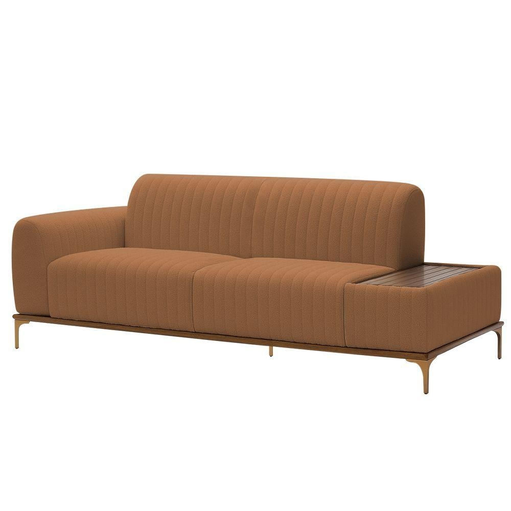 Sofá Molino com Mesa Estofada – Conforto e Praticidade com Elegância Um design funcional e sofisticado que combina estilo, conforto e versatilidade em um só ambiente.Descrição do ProdutoO Sofá Molino com Mesa Estofada eleva o conceito de conforto e funcionalidade a um novo patamar. Com um design moderno e imponente, ele se destaca como a peça central de qualquer ambiente, agora com uma prática mesa estofada integrada — perfeita para apoiar objetos, livros ou decorações, adicionando um toque extra de estilo e praticidade. Suas costuras em linhas retas formam um contraste elegante com o desenho em gomos, unindo razão e emoção em uma peça que transforma sua sala em um espaço acolhedor, sofisticado e funcional.Características TécnicasEstrutura: Madeira reflorestada de eucalipto, com partes em MDF e OSB – robustez e sustentabilidadeAssento: Espuma D-26 HR sobre percintas elásticas – conforto firme e duradouroEncosto: Espuma D-23 sobre percintas elásticas – apoio ergonômicoBraços: Espuma D-23 – maciez e suporteMesa: Estrutura em madeira de eucalipto com bordas estofadas e tampo envernizadoBase/Pés: Madeira de eucalipto envernizada com pés em alumínio com pintura epóxiCor da Base/Pés: Castanho Natural / Ouro FoscoPeso Suportado: Até 100 kg por assentoMedidasAltura Total: 78 cmLargura Total (com mesa estofada): 210 cmProfundidade Total: 85 cmPeso: 80 kgAltura do Encosto: 40 cmAltura do Assento ao Chão: 46 cmAltura do Braço: 20 cmAltura dos Pés: 18 cmLargura Livre do Assento: 145 cmProfundidade Livre do Assento: 55 cmLargura do Braço: 25 cmLargura da Mesa Estofada: 40 cmProfundidade da Mesa Estofada: 90 cmDiferenciaisMesa estofada integrada – praticidade para apoiar objetos com estiloDesign moderno com acabamento em gomos – sofisticação únicaAssento bipartido – maior conforto e estéticaCuidadosLimpeza com pano levemente umedecido com água, seguida de pano seco.Evitar exposição prolongada ao sol para preservar a cor e textura do tecido.Não utilizar produtos abrasivos ou escovas rígidas.Garantia03 meses contra defeitos de fabricaçãoObservações Necessita de montagem simples, fixação da base. Quantidade de volumes: 03. As imagens são ilustrativas; a tonalidade pode variar conforme a configuração da tela. Certifique-se de que o local de instalação permite a passagem do produto. Não nos responsabilizamos por montagem, desmontagem, instalações ou transporte por escadas/elevadores.