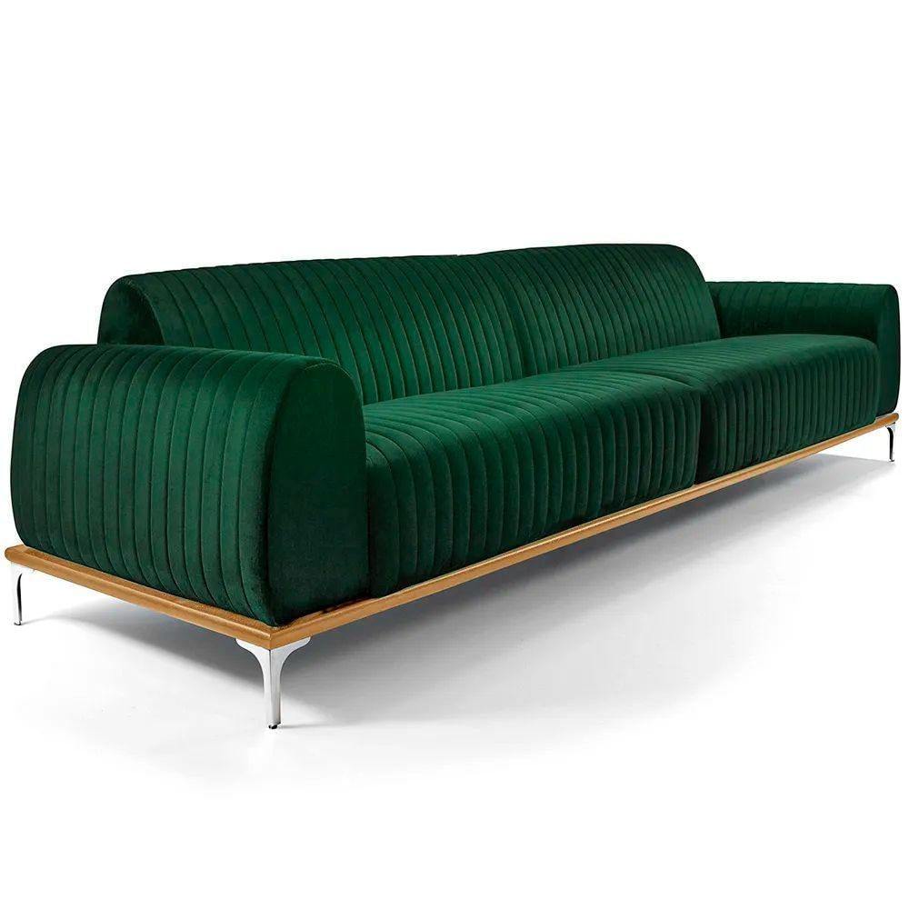 Sofá Molino – Conforto e Elegância em Harmonia Um design imponente e contemporâneo que transforma seu ambiente com sofisticação e conforto incomparável.Descrição do ProdutoO Sofá Molino é a definição de um refúgio perfeito para relaxar. Com um design imponente e contemporâneo, ele se destaca como a peça central de qualquer ambiente, unindo conforto excepcional e sofisticação. Suas costuras em linhas retas criam um contraste elegante com o desenho em gomos, refletindo a perfeita harmonia entre razão e emoção. Ideal para quem valoriza beleza e funcionalidade, o Molino transforma sua sala em um espaço acolhedor e estiloso, proporcionando bem-estar e elegância em cada detalhe.Características TécnicasEstrutura: Madeira reflorestada de eucalipto, com partes em MDF e OSB – robustez e sustentabilidadeAssento: Espuma D-26 HR sobre percintas elásticas – conforto firme e duradouroEncosto: Espuma D-23 sobre percintas elásticas – apoio ergonômicoBraços: Espuma D-23 – maciez e suporteRevestimento: Veludo – visual sofisticado e fácil de manterBase/Pés: Madeira de eucalipto envernizada com pés em alumínio com pintura epóxiCor da Base/Pés: Castanho Natural / CromadoPeso Suportado: Até 120 kg por assentoMedidasAltura Total: 78 cmLargura: 210 cmProfundidade: 90 cmPeso: 80 kgAltura do Encosto: 40 cmAltura do Assento ao Chão: 46 cmAltura do Braço: 20 cmAltura dos Pés: 18 cmLargura Livre do Assento: 160 cmProfundidade Livre do Assento: 55 cmLargura do Braço: 25 cmDiferenciaisDesign moderno com acabamento em gomos – sofisticação únicaBase de madeira reforçada – garantia de durabilidadeCuidadosLimpeza com pano levemente umedecido com água, seguida de pano seco.Evitar exposição prolongada ao sol para preservar a cor e textura do tecido.Não utilizar produtos abrasivos ou escovas rígidas.Garantia03 meses contra defeitos de fabricaçãoObservações Necessita de montagem simples, fixação da base. Quantidade de volumes: 02. As imagens são ilustrativas; a tonalidade pode variar conforme a configuração da tela. Certifique-se de que o local de instalação permite a passagem do produto. Não nos responsabilizamos por montagem, desmontagem, instalações ou transporte por escadas/elevadores.