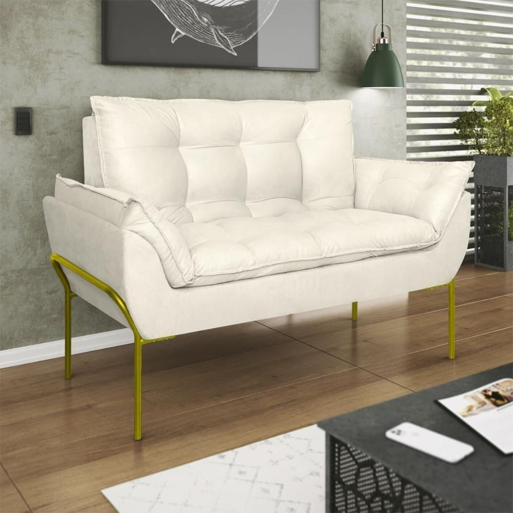 Sofá Namoradeira Base Metal Dourada Reforçada Tecido Suede Bege