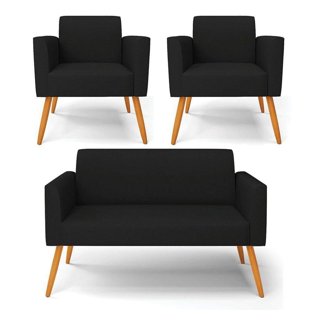 Sofá Namoradeira Com 2 Poltronas Pés Palito Castanho Marisa Linho Preto A79 D03 - D'rossi