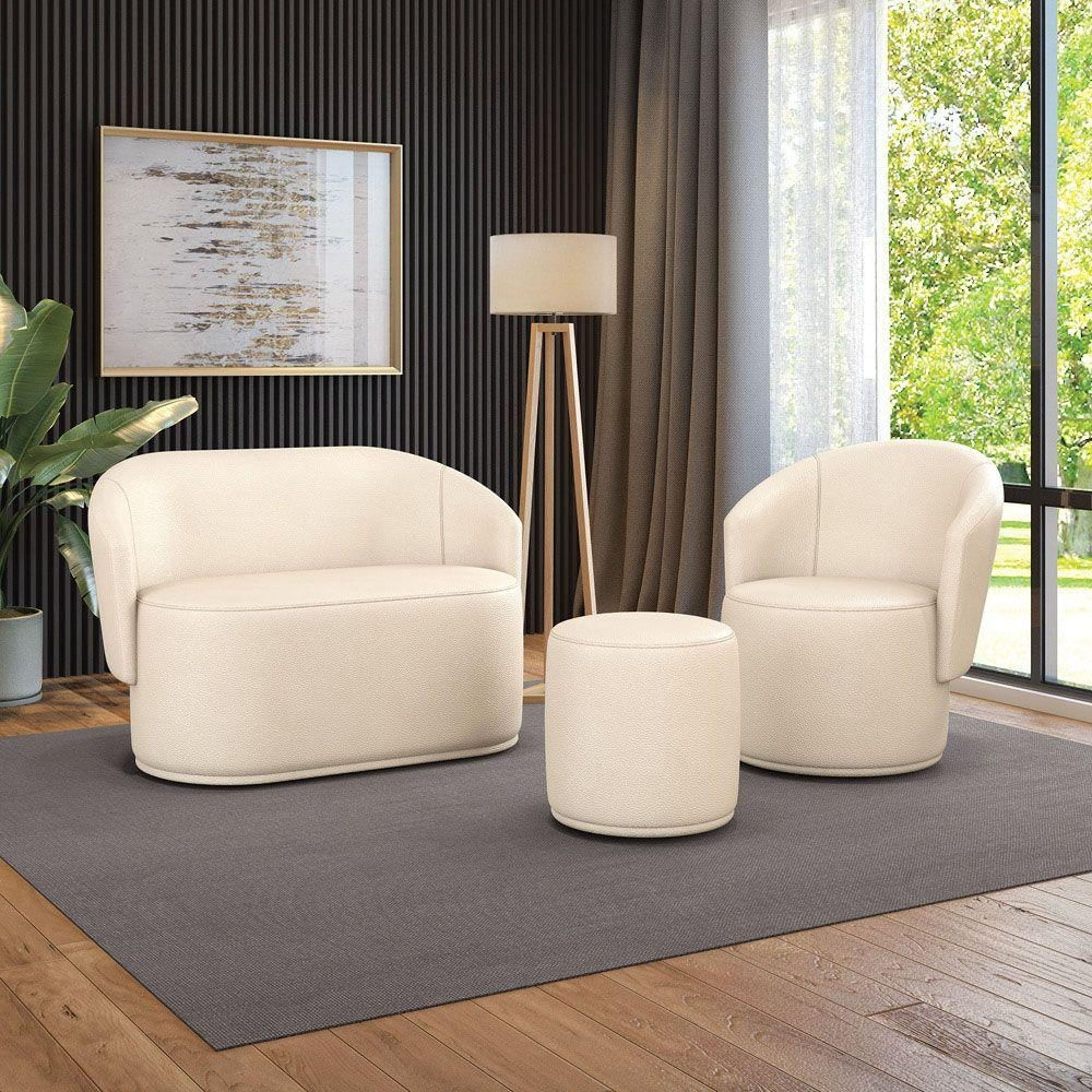 Sofá Namoradeira Com Poltrona E Puff Orgânico Sala Malu Sintético Bege M11 - D'rossi