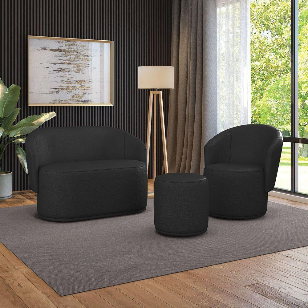 Sofá Namoradeira Com Poltrona E Puff Orgânico Sala Malu Sintético Preto M11 - D'rossi