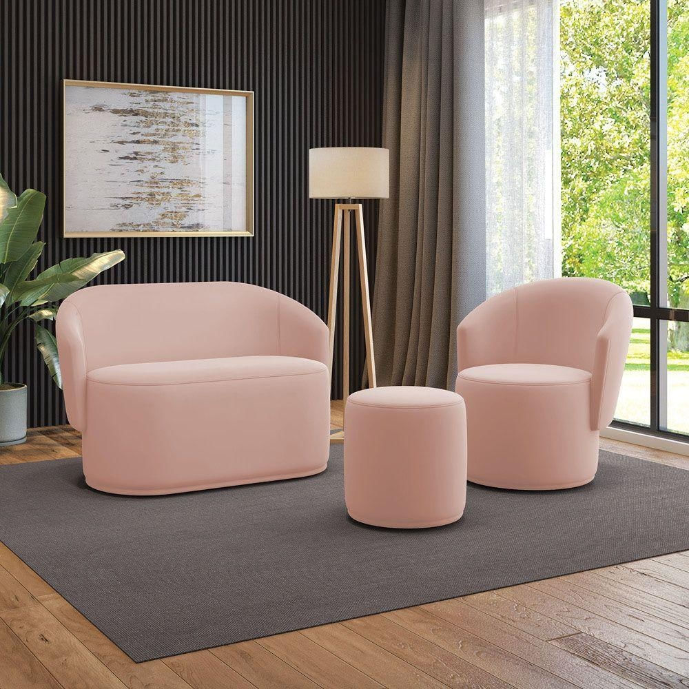 Sofá Namoradeira Com Poltrona E Puff Orgânico Sala Malu Veludo M11 - D'rossi Rose