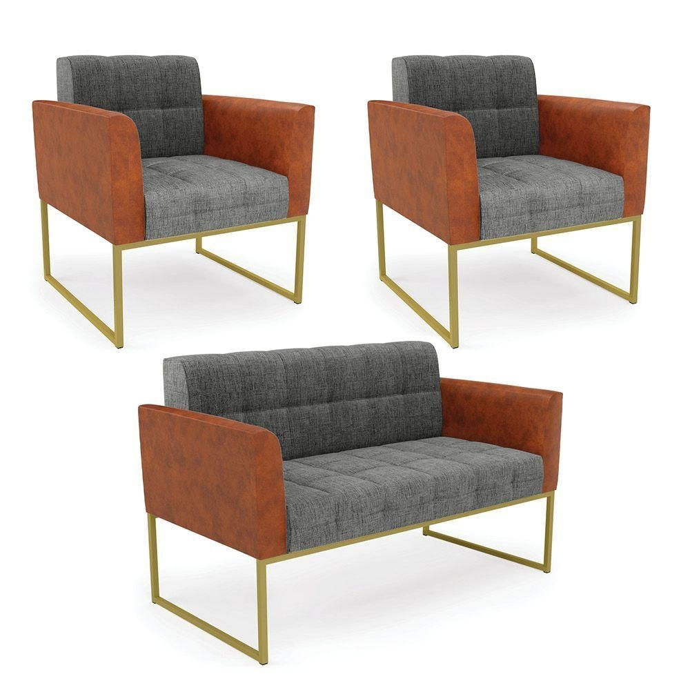 Sofá Namoradeira E 2 Poltronas Base Industrial Dourado Elisa Nozes/linho Grafi A26 D03 - D'rossi