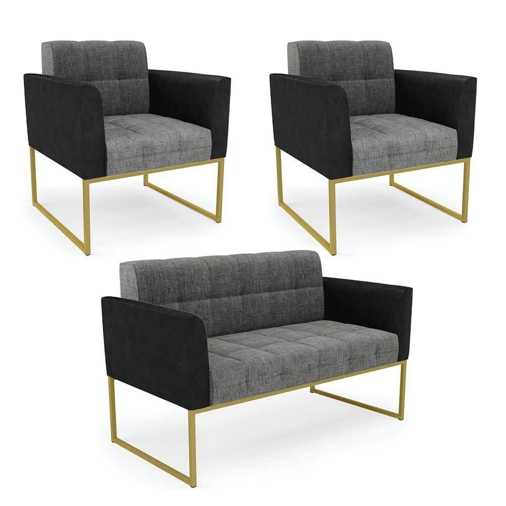 Sofá Namoradeira E 2 Poltronas Base Industrial Dourado Elisa Preto/linho Grafi A26 D03 - D'rossi