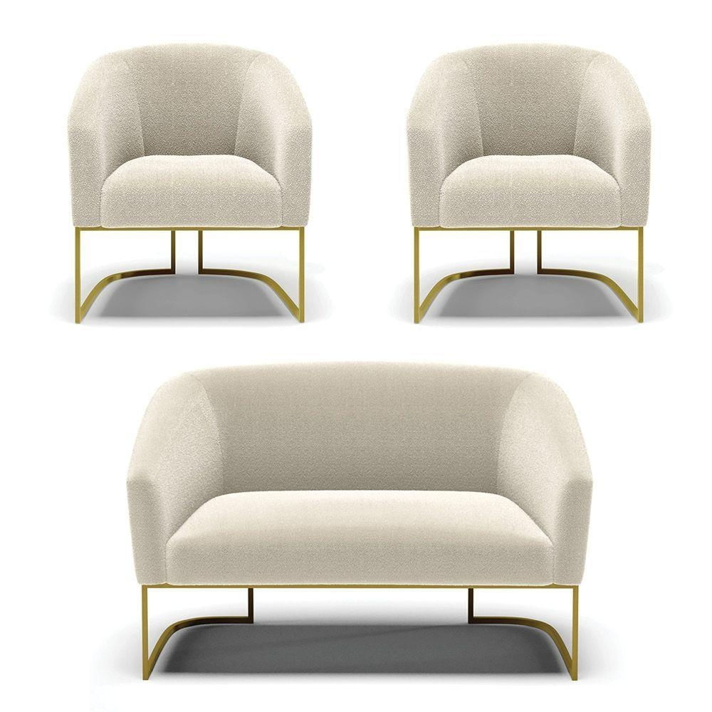 Sofá Namoradeira E 2 Poltronas Base Industrial Dourado Stella Bouclê Bege D03 - D'rossi