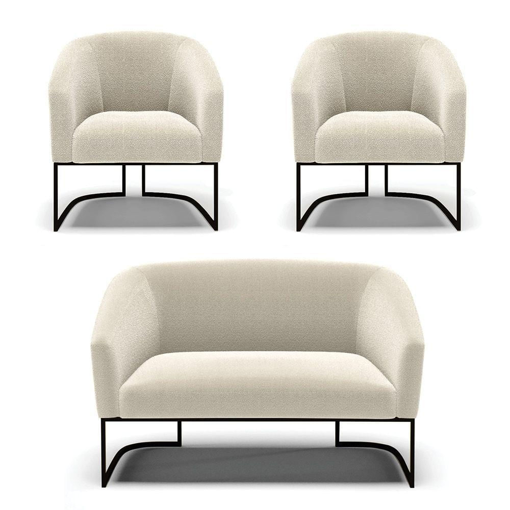 Sofá Namoradeira E 2 Poltronas Base Industrial Preto Stella Bouclê Bege D03 - D'rossi
