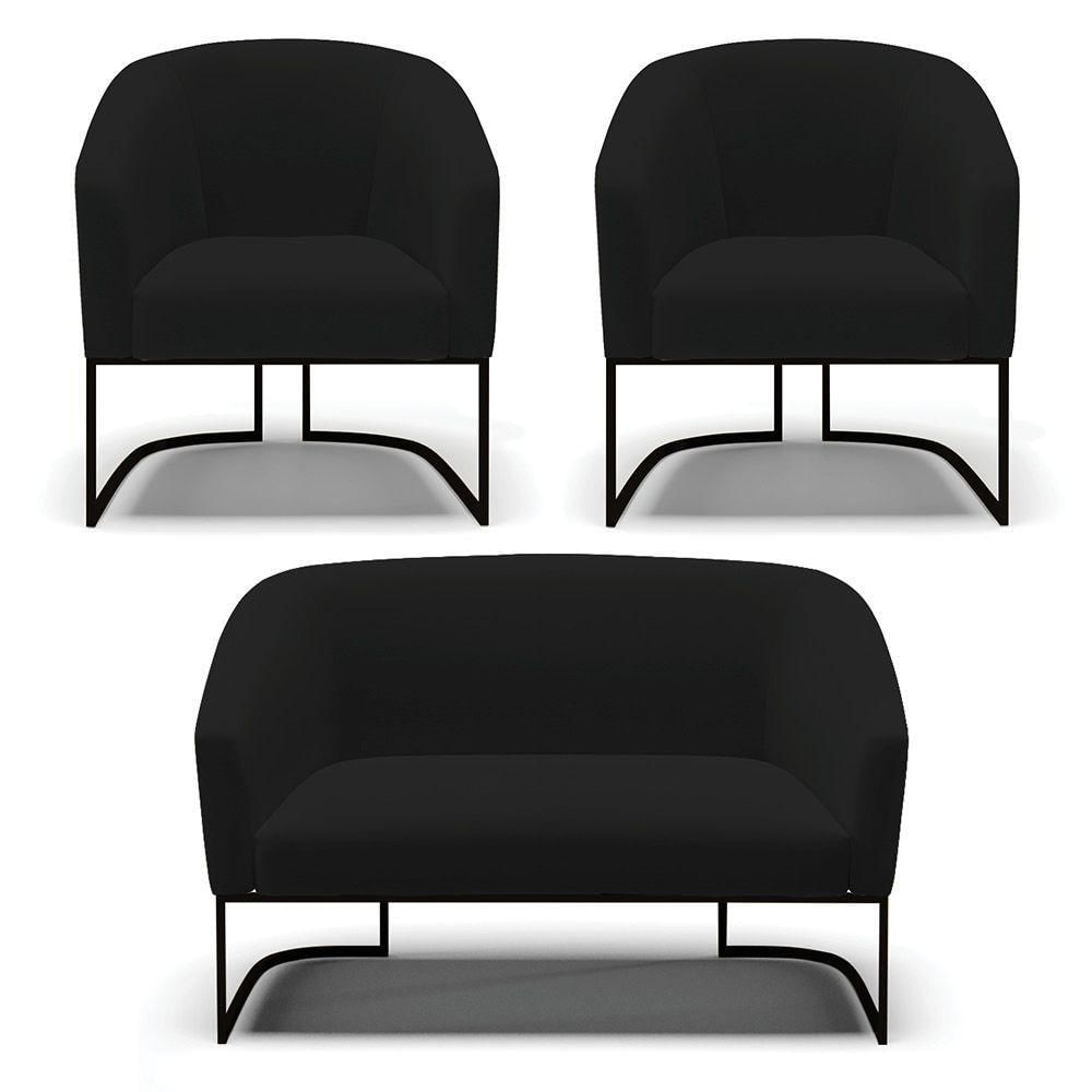 Sofá Namoradeira E 2 Poltronas Base Industrial Preto Stella Linho D03 - D'rossi Cor A79 Preto