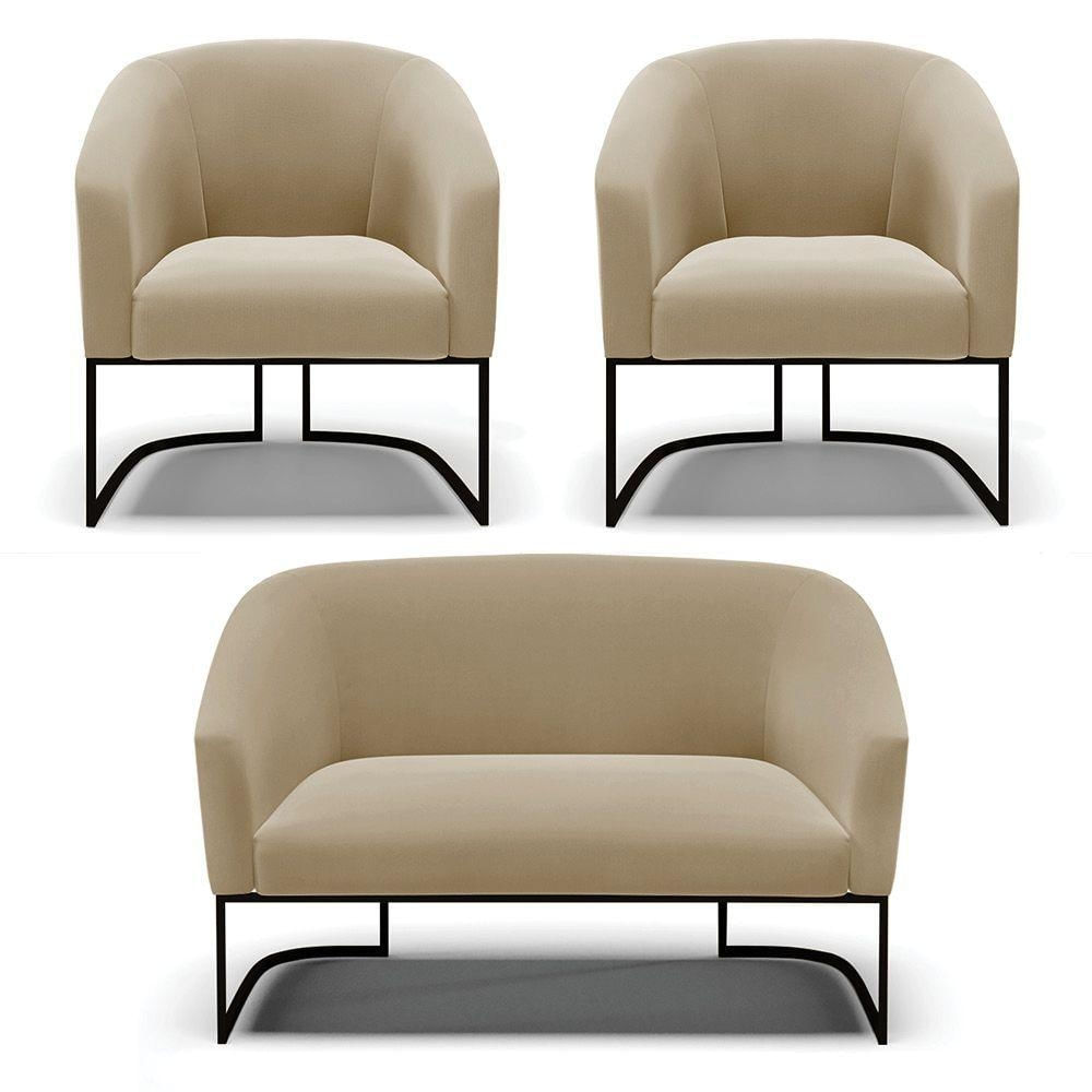 Sofá Namoradeira E 2 Poltronas Base Industrial Preto Stella Suede D03 - D'rossi Cor Marrom Rato