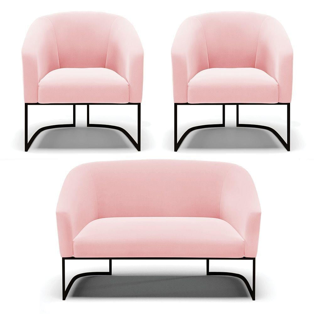 Sofá Namoradeira E 2 Poltronas Base Industrial Preto Stella Suede Rosa Bebê D03 - D'rossi