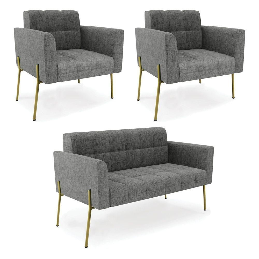 Sofá Namoradeira E 2 Poltronas Pé De Ferro Dourado Elisa Linho Grafite A26 D03 - D'rossi