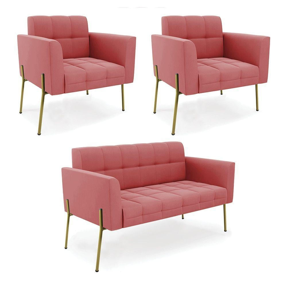 Sofá Namoradeira E 2 Poltronas Pé De Ferro Dourado Elisa Suede Rosê D03 - D'rossi