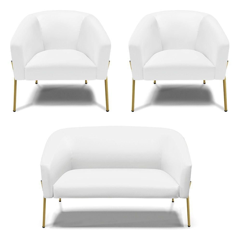 Sofá Namoradeira E 2 Poltronas Pé De Ferro Dourado Stella Corino D03 - D'rossi Cor Branco
