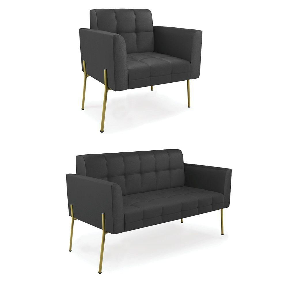 Sofá Namoradeira E Poltrona Base Pé De Ferro Dourado Elisa Corino D03 - D'rossi Cor Preto