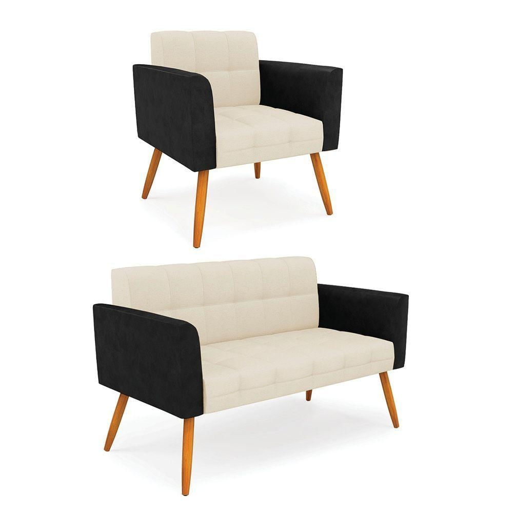 Sofá Namoradeira E Poltrona Pés Palito Castanho Elisa Preto/linho Bege A19 D03 - D'rossi