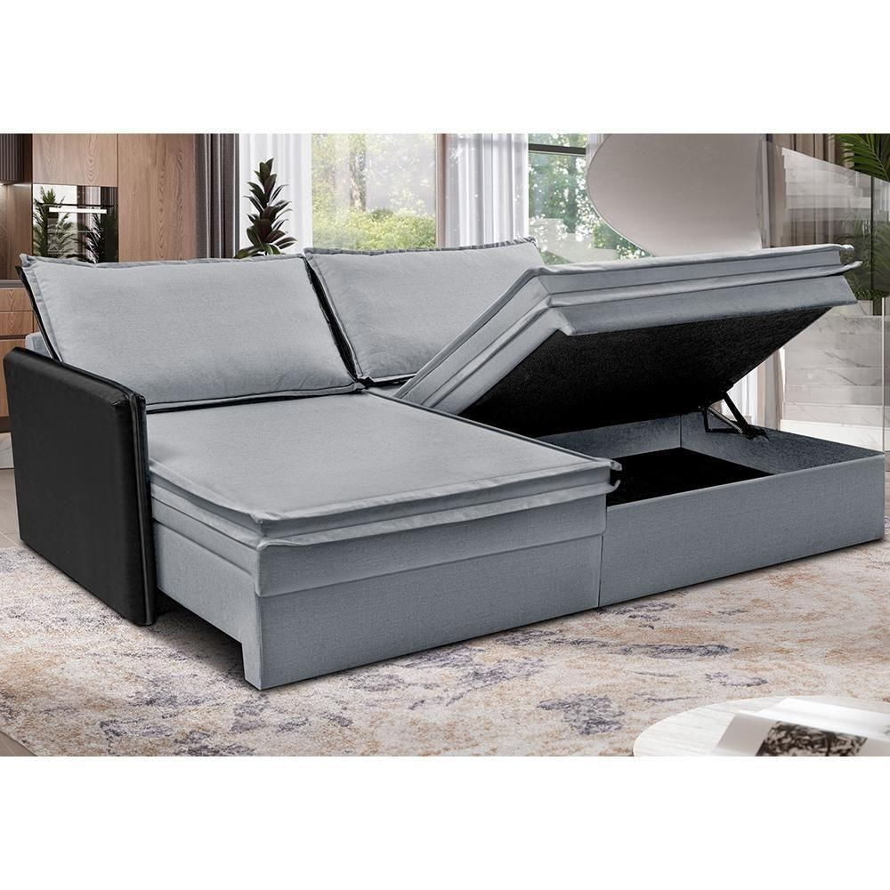 Sofá Sem Caixa Retrátil Baú 1,95m Cama Inbox Grace Tecido Linho E Courino Cinza Claro