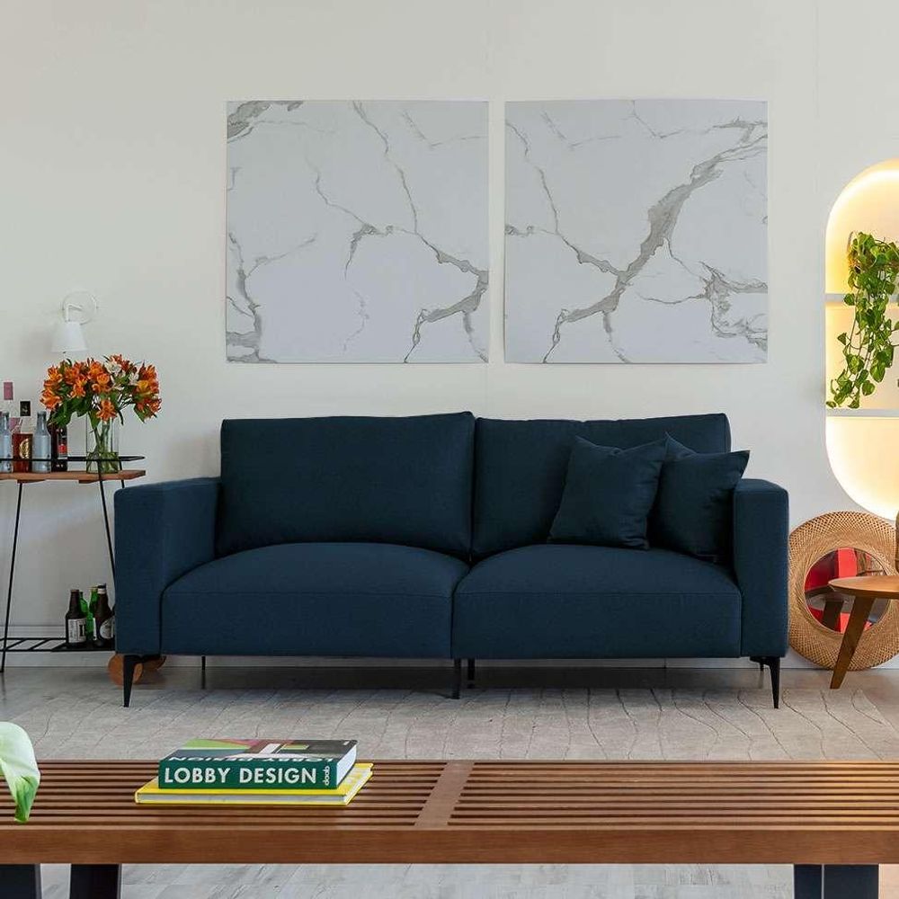Que tal o Sofá na Caixa Unne? A Mobly tem prazer em apresentar mais um produto da nossa marca de móveis exclusivos Keva: o Sofá na Caixa Unne. Com proposta inovadora e design mais do que especial, ele traz uma solução prática para o momento do transporte e da montagem, sem deixar que nada do conforto ou da beleza se percam. Embalado e entregue em 4 caixas compactas para facilitar o deslocamento, ele foi pensado para ser montado em sua casa, de forma fácil e sem necessidade de ferramentas especiais - as ferragens e o manual acompanham a embalagem e o encaixe das partes é simples para que qualquer pessoa consiga fazer.O tamanho de 200 cm é ideal para aconchegar a família, ainda mais porque ele conta com assento reforçado por molas e percintas elásticas, enquanto o encosto é preenchido com manta siliconada, que proporciona a comodidade perfeita. Já os pés são em aço carbono e, junto à montagem inteligente e facilitada, formam um móvel sólido que não perde em nada para os que já vêm prontos da loja. O linho na cor azul marinho garante o acabamento perfeito para um sofá moderno e de muito bom gosto, feito para destacar a decoração da sua sala de estar e embalar ótimos momentos de descanso e lazer.