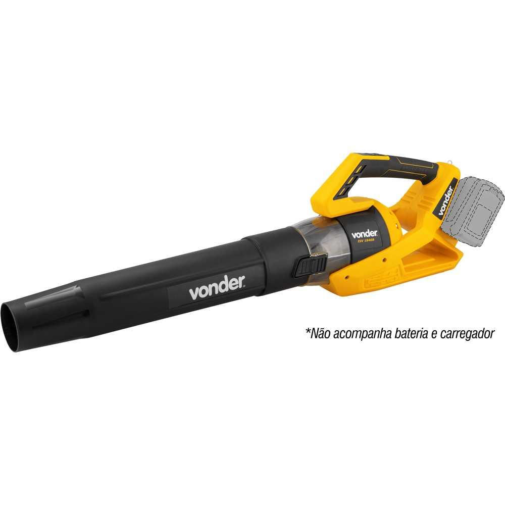 Indicado para soprar folhas, grama cortada, serragem de madeira e outros resíduos leves que estejam em pisos, terrenos, calçadas, jardins e outras áreas residenciais. Pode ser usado também para secagem de superfícies lisas que estejam com água. Funcionamento apenas com duas baterias (utilizar baterias de mesma capacidade (Ah)). Não acompanha bateria e carregador. BATERIAS INDICADAS: (4 Ah) IBV 1804 - 60.04.180.400 (5 Ah) IBV 1850 - 60.04.185.000 (8 Ah) IBV 1880 - 60.04.188.000 CARREGADORES INDICADOS: Carregamento convencional ICBV 1805 - 60.04.180.500 Carregamento convencional duplo ICBV 1841- 60.04.184.100 Carregamento rápido ICBV 1806 - 60.04.180.600 Carregamento rápido duplo ICBV 1842 - 60.04.184.200 Carregador inteligente ICBV 1849 - 60.04.184.900 Carregador convencional com conector automotivo 12 V ICBV 1843 - 60.04.184.300. Este equipamento utiliza um modelo de bateria que pode ser intercambiável (não acompanha), ou seja, uma bateria que é compatível com outros modelos de ferramentas a bateria VONDER. Por isso, em sua próxima compra de ferramenta a bateria VONDER, procure um modelo que comece com a referência “I”, ou que esteja identificado com o selo “Bateria Intercambiável VONDER”. Desta forma, você garante modelos mais econômicos, sem a necessidade de aquisição de novas baterias e carregadores para uso em seu equipamento. Robusto, potente e eficiente, possui punho emborrachado com formato ergonômico, proporcionando maior conforto na operação. Conta ainda com painel controlador, com 4 ajustes de velocidade e LEDs indicadores de nível de velocidade e de carga de cada bateria. Possui ainda, função TURBO, a qual potencializa ainda mais o volume e velocidade de ar. Além de motor Brushless (sem escova de carvão), que garante maior durabilidade, resistência e desempenho. Suas 2 baterias (não acompanham), proporcionam maior autonomia de trabalho se comparado aos modelos tradicionais com apenas 1 bateria. Modelo: ISV 1846B | Velocidade do ar: Nível 1: 90 km/h; Nível 2: 108 km/h; Nível 3: 133 km/h; Nível 4: 151 km/h; TURBO: 208 km/h | Volume de saída de ar.: Nível 1: 396 m³/h; Nível 2: 444 m³/h; Nível 3: 528 m³/h; Nível 4: 600 m³/h; TURBO: 828 m³/h | Rotação - rpm: Máx: 23.000/min | Nível de ruído (dB(A)): 102 dB(A) | Massa aproximada (peso) (kg): 2,1 kg