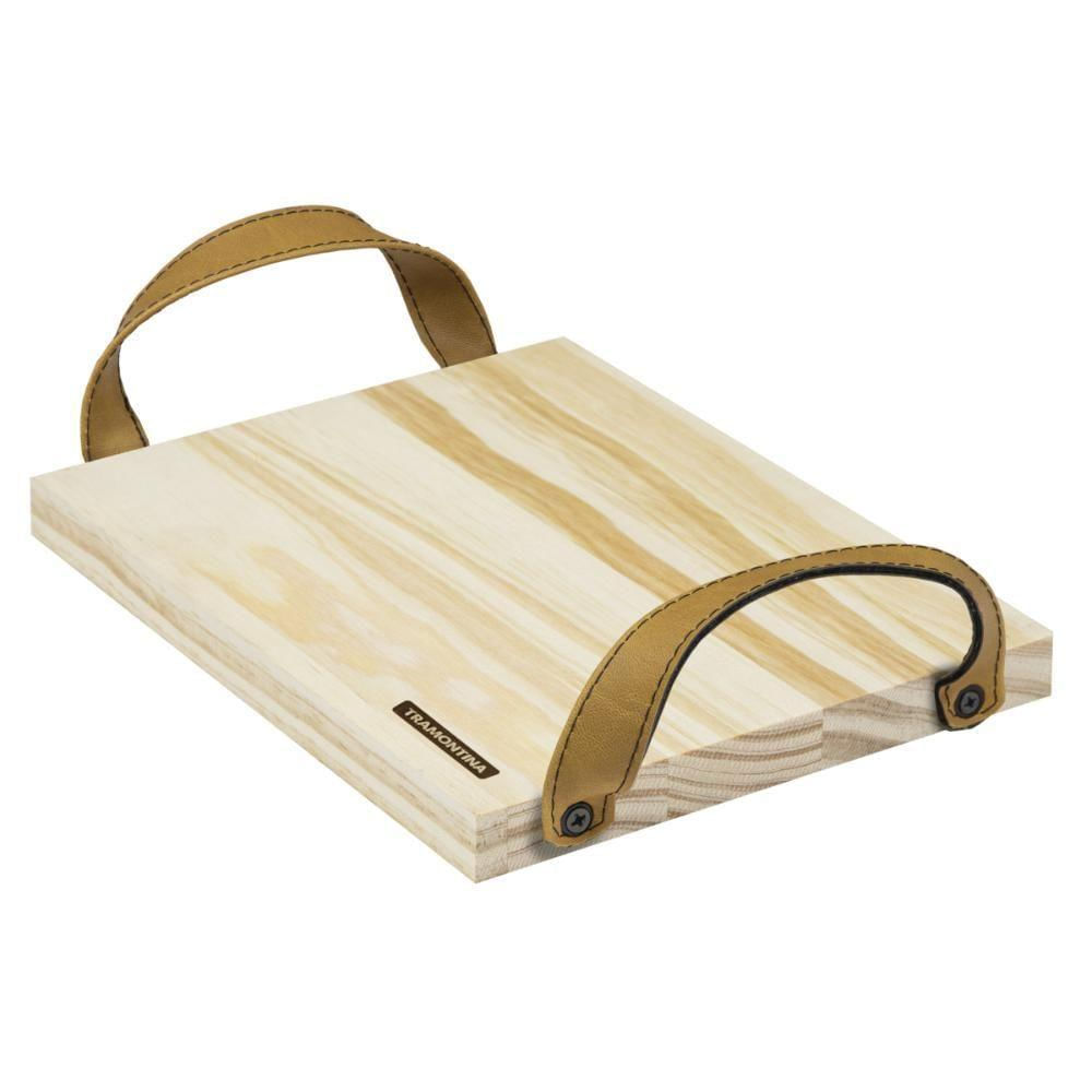 Tábua de Apoio Tramontina em Madeira Maciça com Acabamento Natural 25x19 cm A tábua de apoio Tramontina em madeira maciça com acabamento natural 25x19 centímetros é a escolha ideal para você servir suas receitas com muito mais estilo. Desenvolvida com madeira maciça de pinus com acabamento natural, ela possui alças laterais em couro sintético e tem capacidade para 10 quilos. O item perfeito para conceder um toque rústico à sua cozinha e ao mesmo tempo, decorar o ambiente!