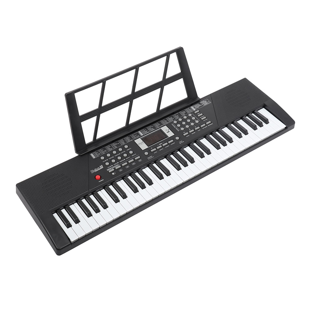 - 01 Teclado Portátil 61 Teclas Rhythmic 20 - 01 Estante de Partitura - 01 Microfone - 01 Cabo de Áudio - 01 Fonte Bivolt 5V - Adesivos com notas, manual de instruções