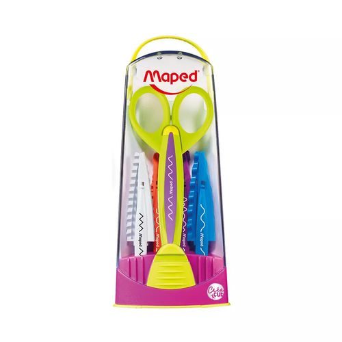 A Tesoura Escolar Maped, adaptam-se a todas as necessidades e a todos os estilos. É ideal para trabalhos artesanais. Possui 5 conjuntos de lâminas com cortes criativos diferentes. Confortável e leve, além disso, possuir alta durabilidade, para auxiliar nas tarefas diárias.