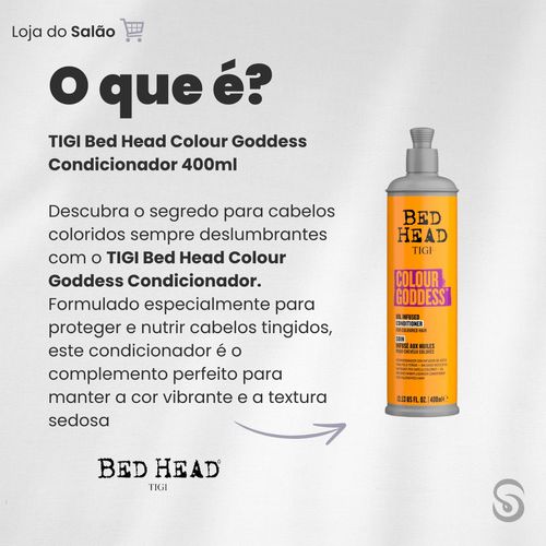 Informações Tecnicas | contemTIGI Bed Head Colour Goddess Condicionador - 400mlO que você vai receber:Ao adquirir o TIGI Bed Head Colour Goddess Condicionador, você estará levando para casa não apenas um produto, mas um aliado essencial para a manutençãoControleControle do frizz CuidadoDisciplina, Hidratação imediata, Nutrição e maciez, Proteção da cor, Rejuvenecimento, Repara os pontas EstadoCom frizz, Com química, Seco FormaFino GêneroFeminino LuminosidadeBrilho natural modo-de-usoGuia Completo de Uso: TIGI Bed Head Colour Goddess Condicionador 400mlOlá, querido cliente! Como seu cabeleireiro especialista, estou aqui para compartilhar com você todos os segredos para tirar o máximo proveitsobre-o-produtoDescubra o segredo para manter seu cabelo colorido vibrante e cheio de vidacom o TIGI Bed Head Colour Goddess CoTIGIColour Goddess TomColorido Volumeml |