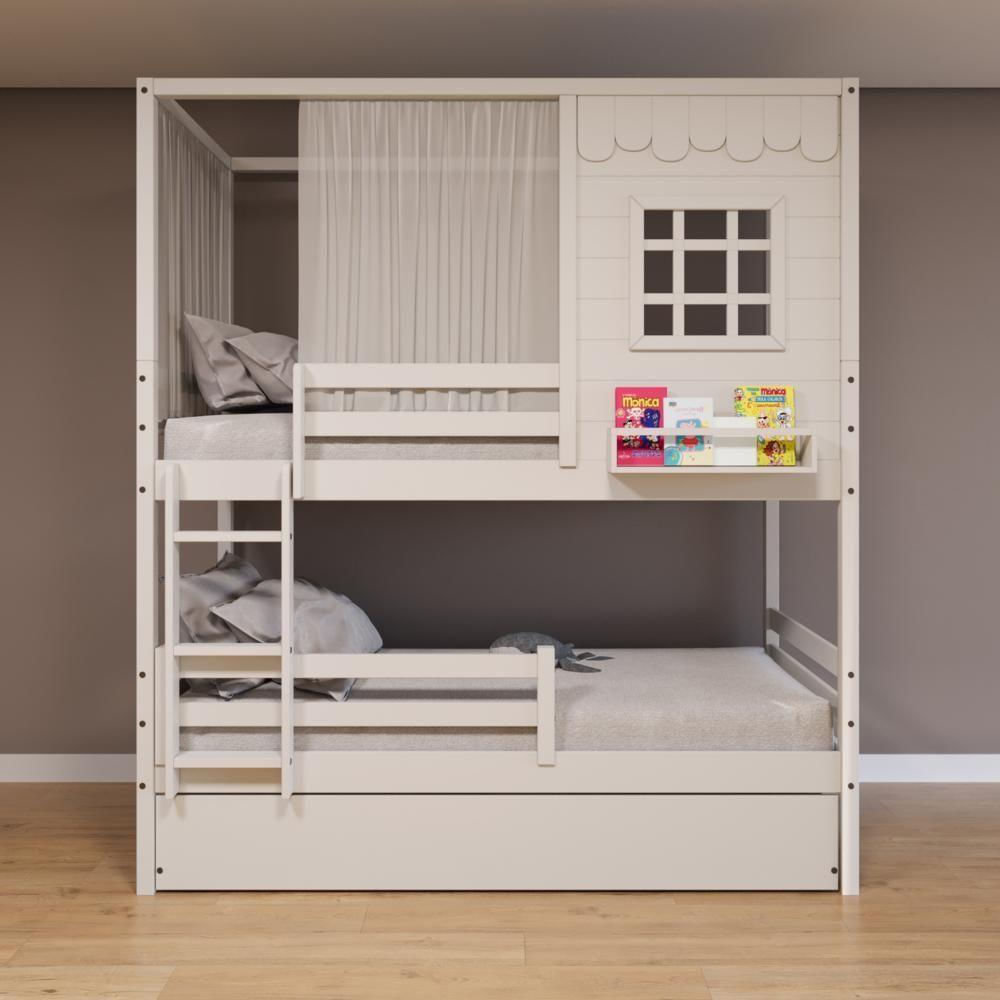 DETALHES Acabamento: Branco PU (pode mostrar veios da madeira) Estrutura: Madeira Maciça de Pinus de Reflorestamento Medidas dos Colchões de Solteiro (cm x cm): 88x188 (Não Incluso) Medidas do Colchão da Cama Auxiliar (cm x cm): 88x188 e Altura Máxima 14 (Não Incluso) Peso Suportado Cama de Solteiro: 120 Kg Peso Suportado Cama de Auxiliar: 120 Kg Diferenciais: Escada Fixa, Auxiliar com 4 Rodízios, Grade Removível, Cortina Superior, Casinha com fechamento em MDF, Janela e Prateleira para Livros e Decoração, Montagem Reversível (Lado Direito ou Lado Esquerdo) DIMENSÕES DO BELICHE MONTADO Altura (cm):225 Largura (cm):199,4 Profundidade (cm):96,6