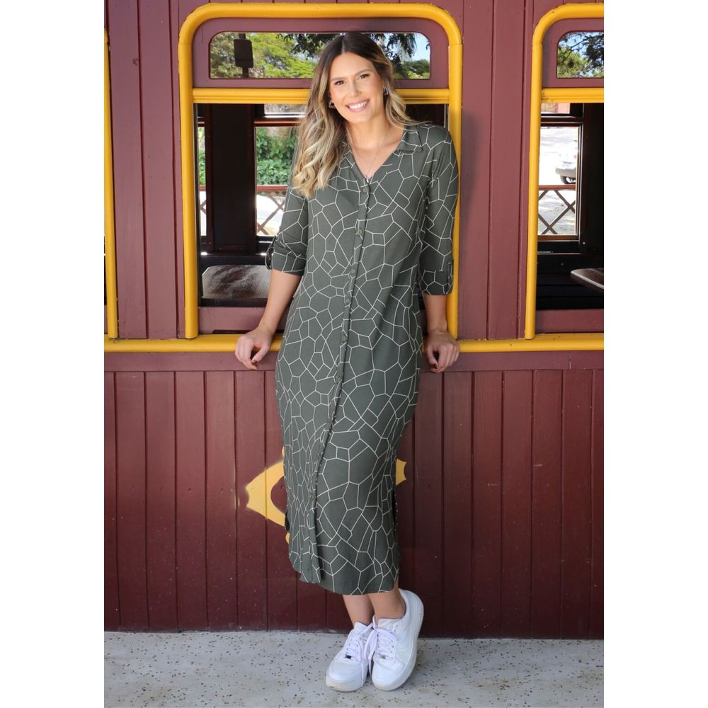 Vestido Chemise com gola e mangas 3/4.